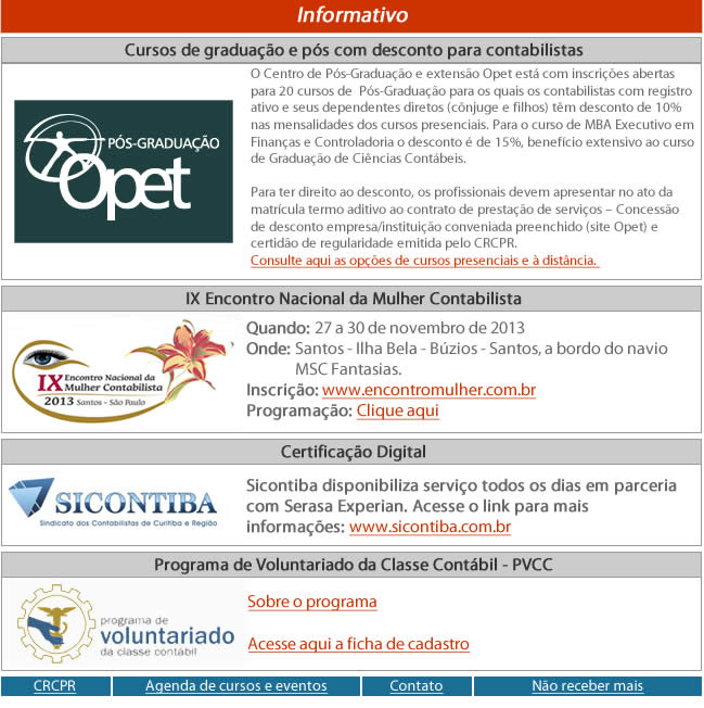 Leia mais… Leia mais… Leia mais… Leia mais… Leia mais… Site da 16ª Convenção Mulher Empreendedora Pós-Graduação Opet Descadastre-se para não receber mais nossos emails… Fale conosco Cursos e eventos da sua cidade Site oficial do CRCPR Clique aqui para ir para a página de inscrição… Clique aqui para saber mais sobre o programa… Clique aqui para maiores informações… Clique aqui para ir para a página de inscrição… Clique aqui para ver a programação…