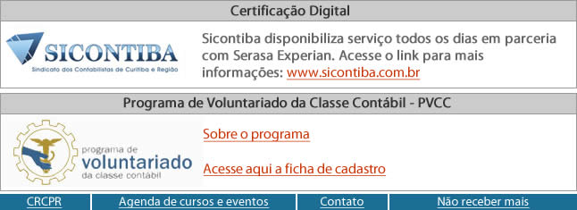 Saiba mais… Saiba mais… Saiba mais… Saiba mais… Saiba mais… Descadastre-se para não receber mais nossos emails… Fale conosco Cursos e eventos da sua cidade Site oficial do CRCPR Clique aqui para ir para a página de inscrição… Clique aqui para saber mais sobre o programa… Clique aqui para maiores informações…