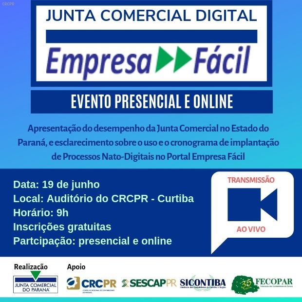 Evento gratuito apresentará o desempenho da Jucepar e esclarecimentos sobre o uso da Plataforma Empresa Fácil e cronograma de implantação de Processos Nato-Digitais